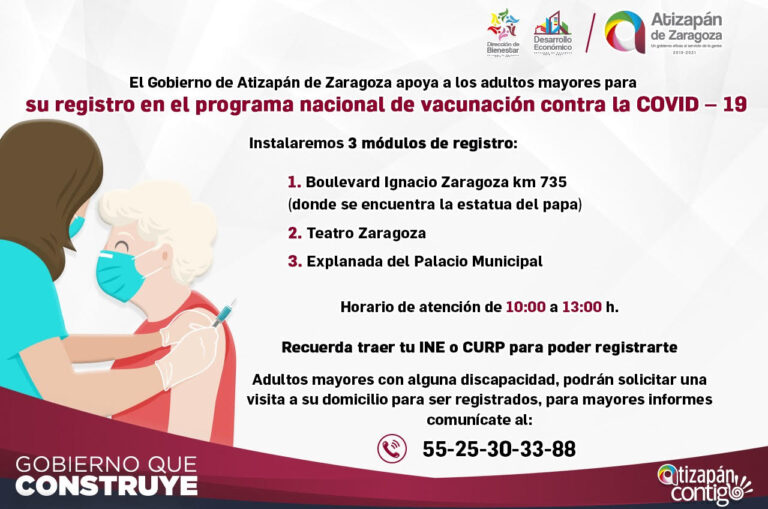El Gobierno de Atizapán de Zaragoza apoya a los adultos mayores que no cuenten con el conocimiento, equipo de cómputo o internet, para su registro en el programa nacional de vacunación contra el COVID19.