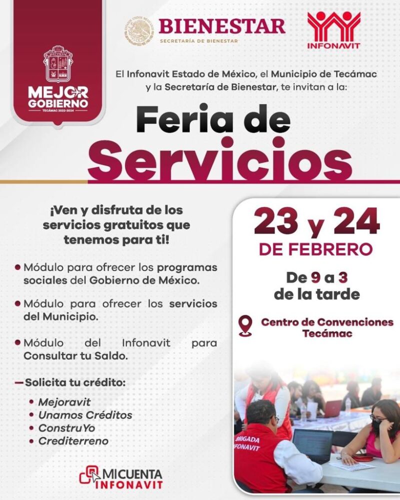 20 de febrero de 2023 Tecámac, Estado de México.- El gobierno municipal de Tecámac, invita a todos los derechohabientes del Instituto del Fondo Nacional de la Vivienda para los Trabajadores (Infonavit), a que acudan a la “Feria de Servicios” que se realizará los días 23 y 24 de febrero. En el Centro de Convenciones, los […]