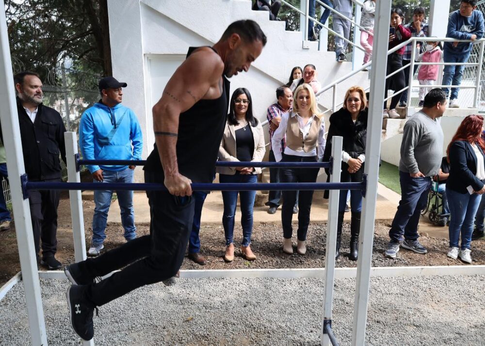 En compañía de vecinos, la presidenta municipal de Huixquilucan recordó que, en una primera etapa, se inaugurarán 14 gimnasios de aparatos de calistenia, por lo que invitó a la población a acercarse a este nuevo espacio y comenzar a activarse.