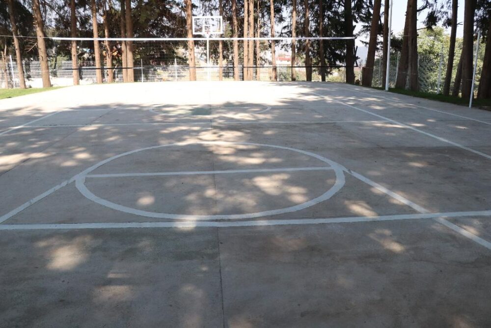 Para llevar a cabo la rehabilitación de la cancha de usos múltiples, se demolieron y repararon piedras en mal estado; se colocaron tableros de basquetbol, tubos y red de voleibol y se pintaron las canchas.
