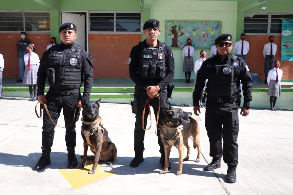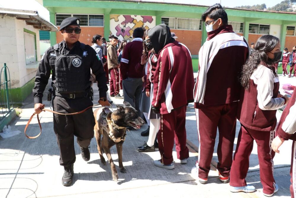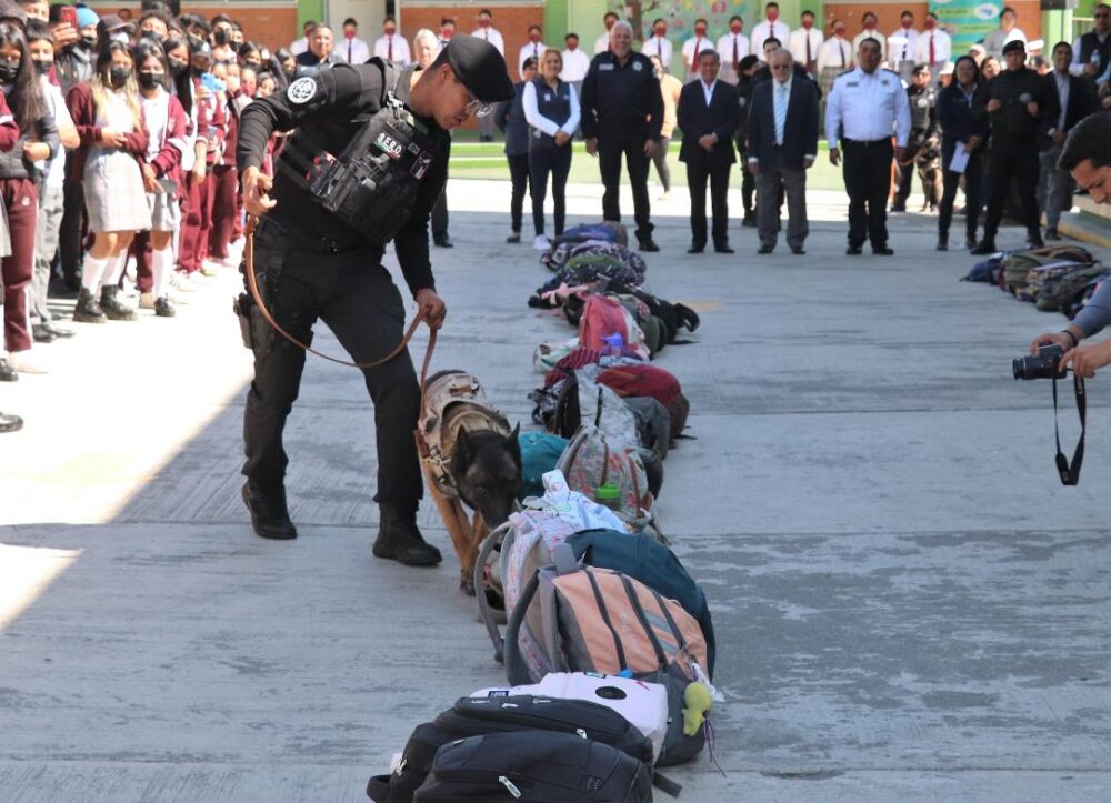 Como parte del programa “Mochila Segura”, fueron revisadas mil mochilas de alumnos del turno matutino, con la participación de dos binomios caninos, integrados por elementos de la Dirección General de Seguridad Pública y Vialidad, así como de Killer y Blacky, dos pastores belgas que fueron entrenados desde los tres meses de edad para recibir órdenes precisas en la búsqueda y localización de cadáveres, personas desaparecidas, armas de fuego, así como localizar drogas dentro de una maleta, vehículo o en lugares abiertos, entre otras tareas.