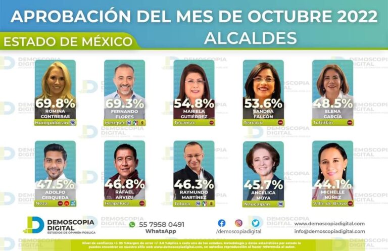 En la más reciente encuesta de Demoscopia Digital, correspondiente al mes de octubre de 2022 y publicada este jueves 03 de noviembre, la alcaldesa de Huixquilucan, Romina Contreras, obtuvo un porcentaje de aprobación de 69.8 por ciento, el más alto entre los 10 presidentes municipales del Estado de México medidos.